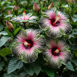 Гибискус «Амбер Лайт» — это воплощение нежности и элегантности, завораживающее своей необычной красотой. Представьте: крупные белоснежные цветки, словно облака, с нежным розовым румянцем в центре и тонкими чёрными прожилками, словно изящное кружево, рассыпанное по лепесткам. Этот гибискус создан для тех, кто ценит изысканность и стремится создать в своём саду атмосферу спокойствия и гармонии. Его красота завораживает и вдохновляет на создание райского уголка на вашем участке.